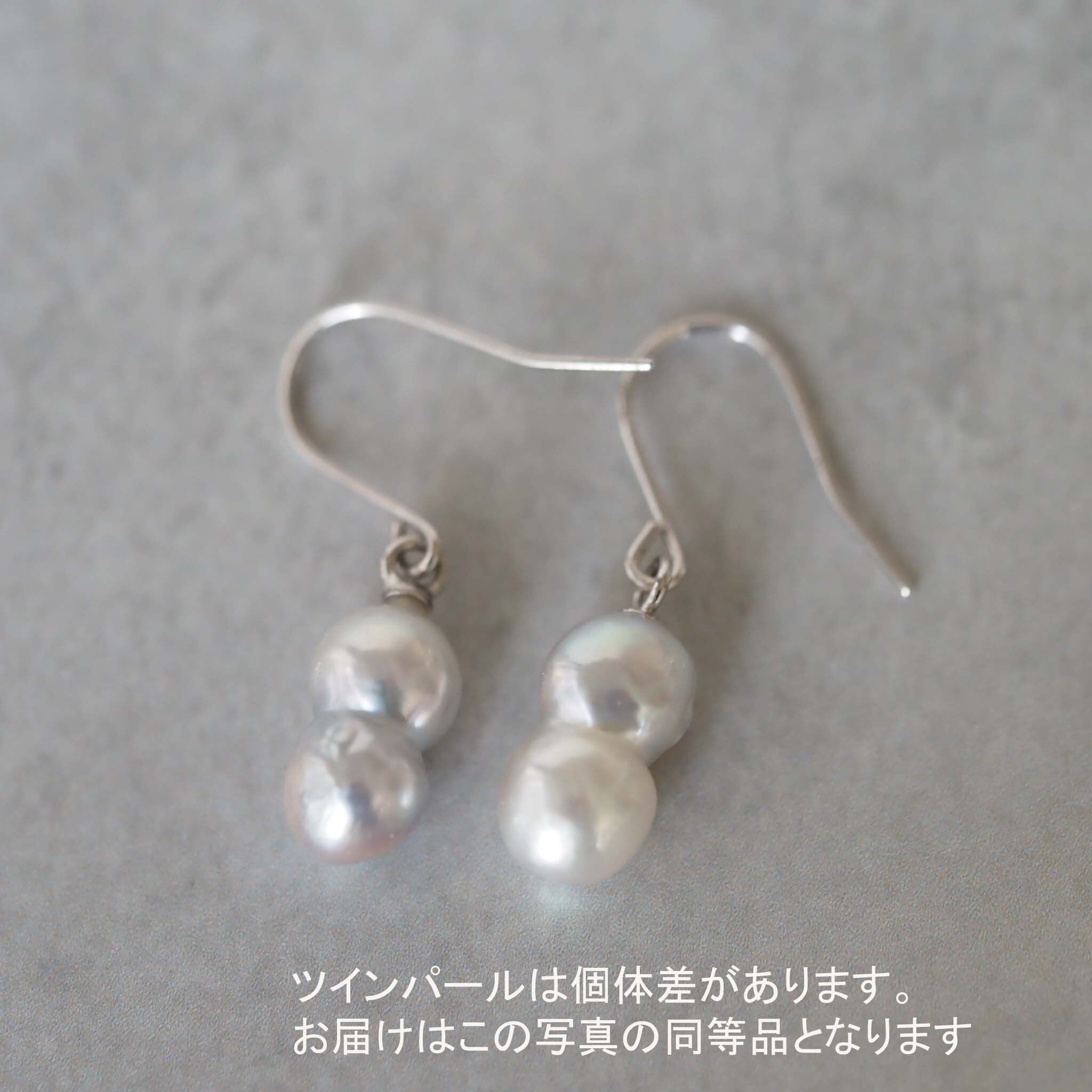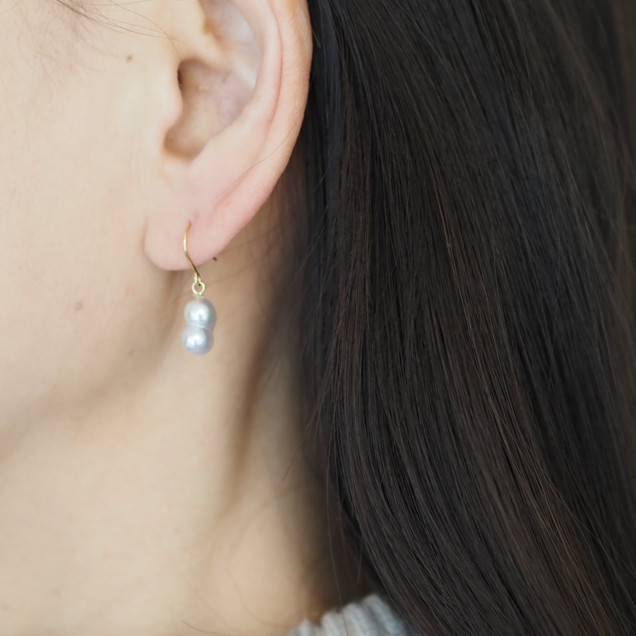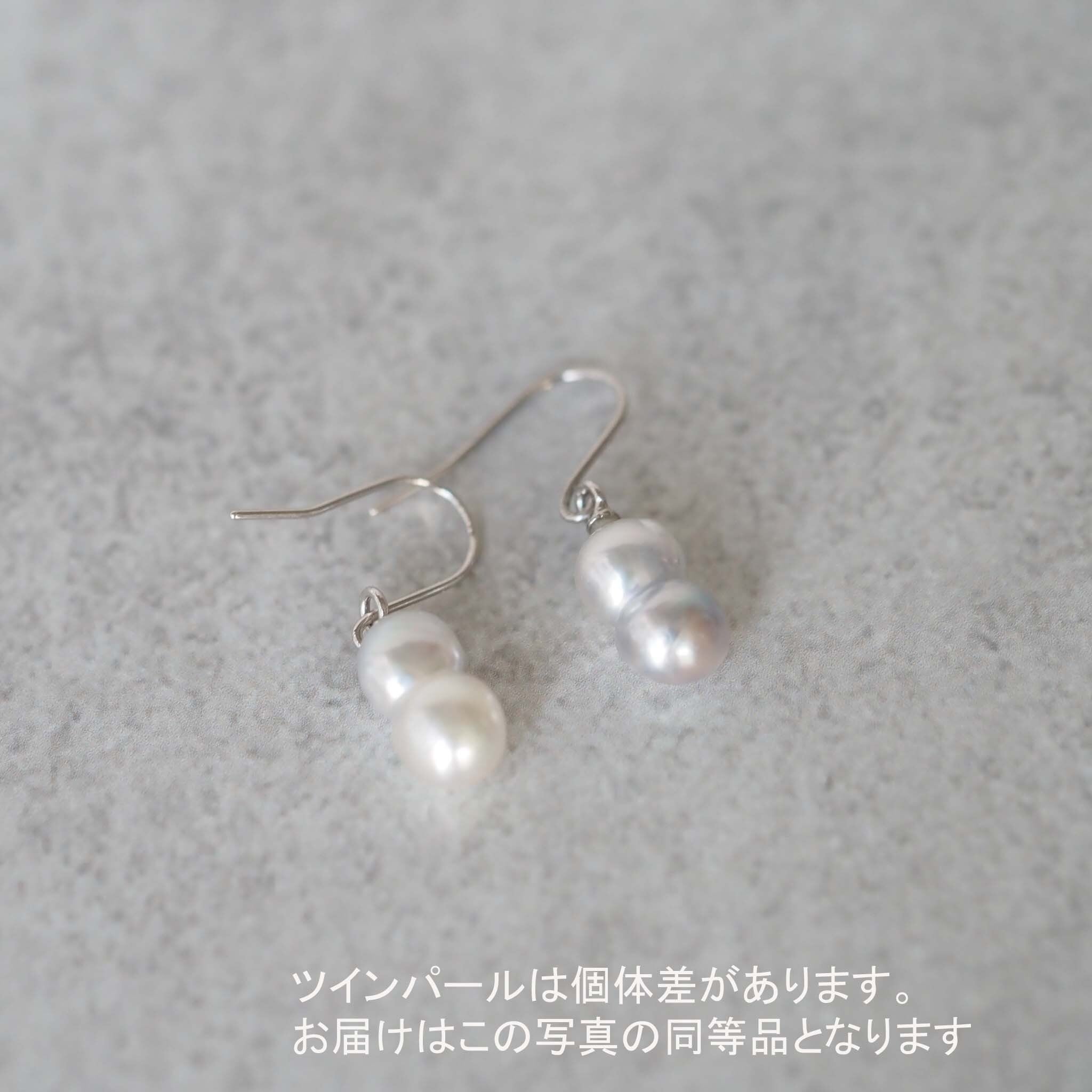 あこや貝の中で、二つの核が偶然にくっついて生まれた「ツインパール」。 自然が生み出したその個性豊かなフォルムを、耳元で軽やかに揺れるフックピアスにお仕立てしました。